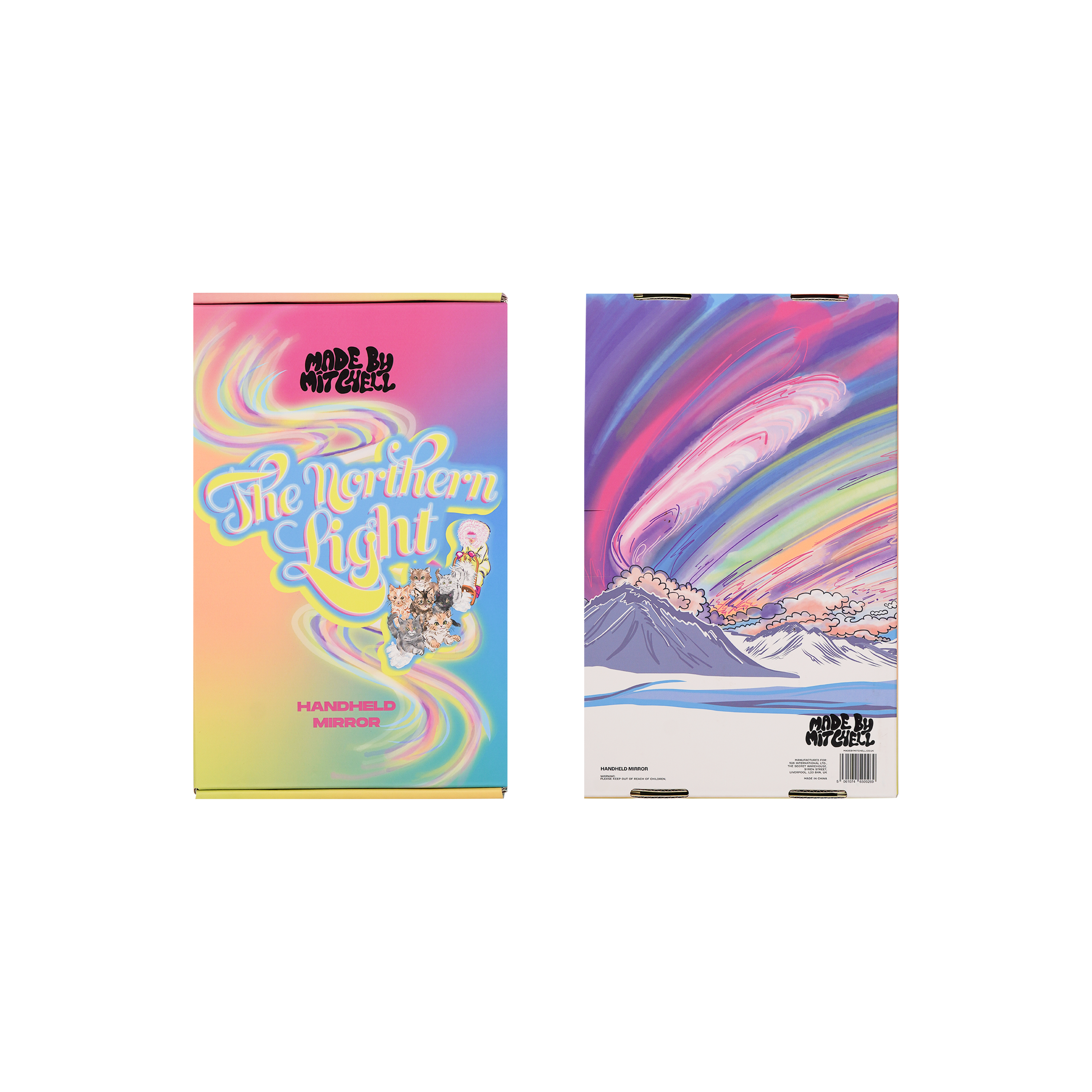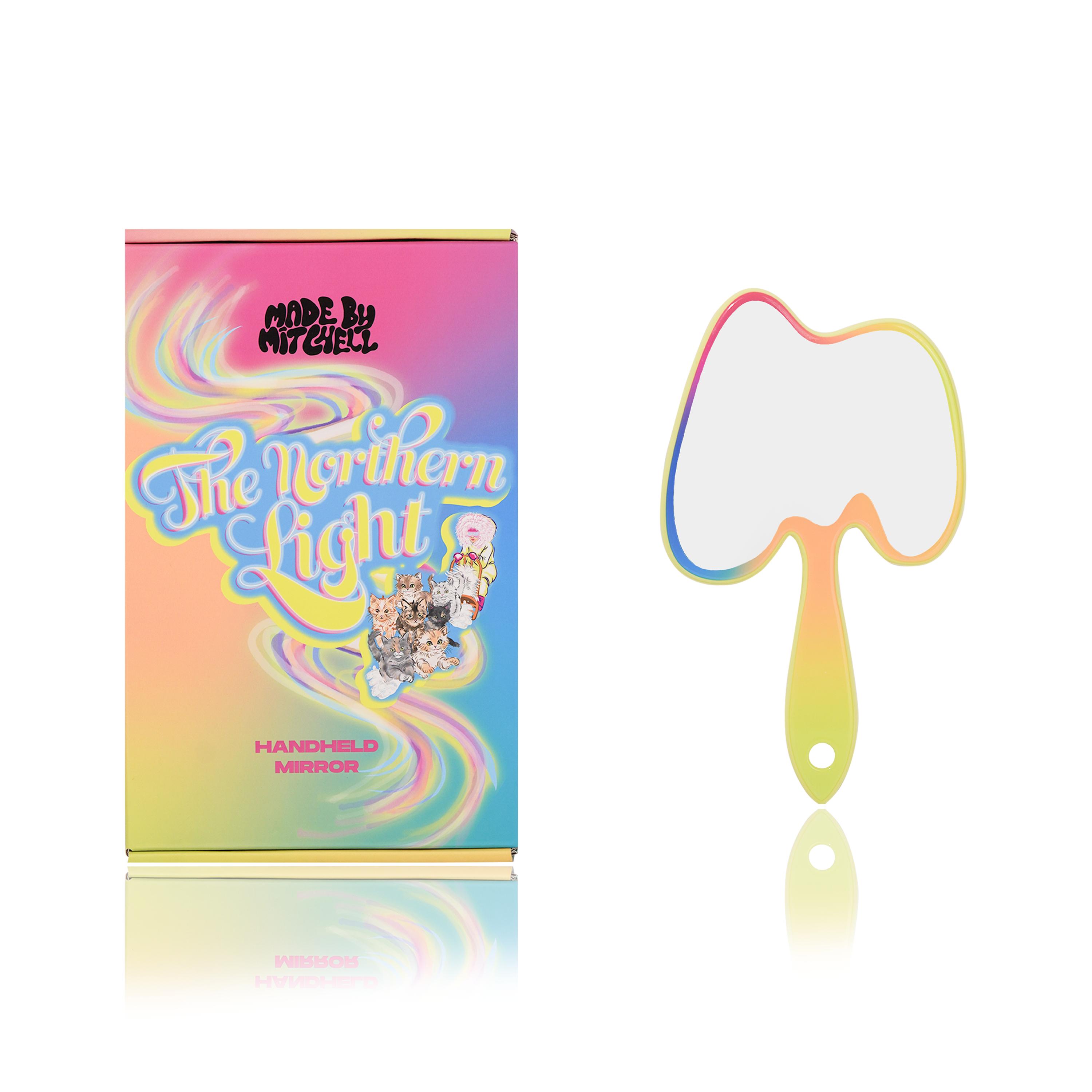 Wrapped in a bold rainbow gradient inspired by the Northern Lights, this mirror brings colour and joy to every routine. The sturdy handle fits perfectly in your hand, making it easy to perfect every blend, liner flick, and lip.
