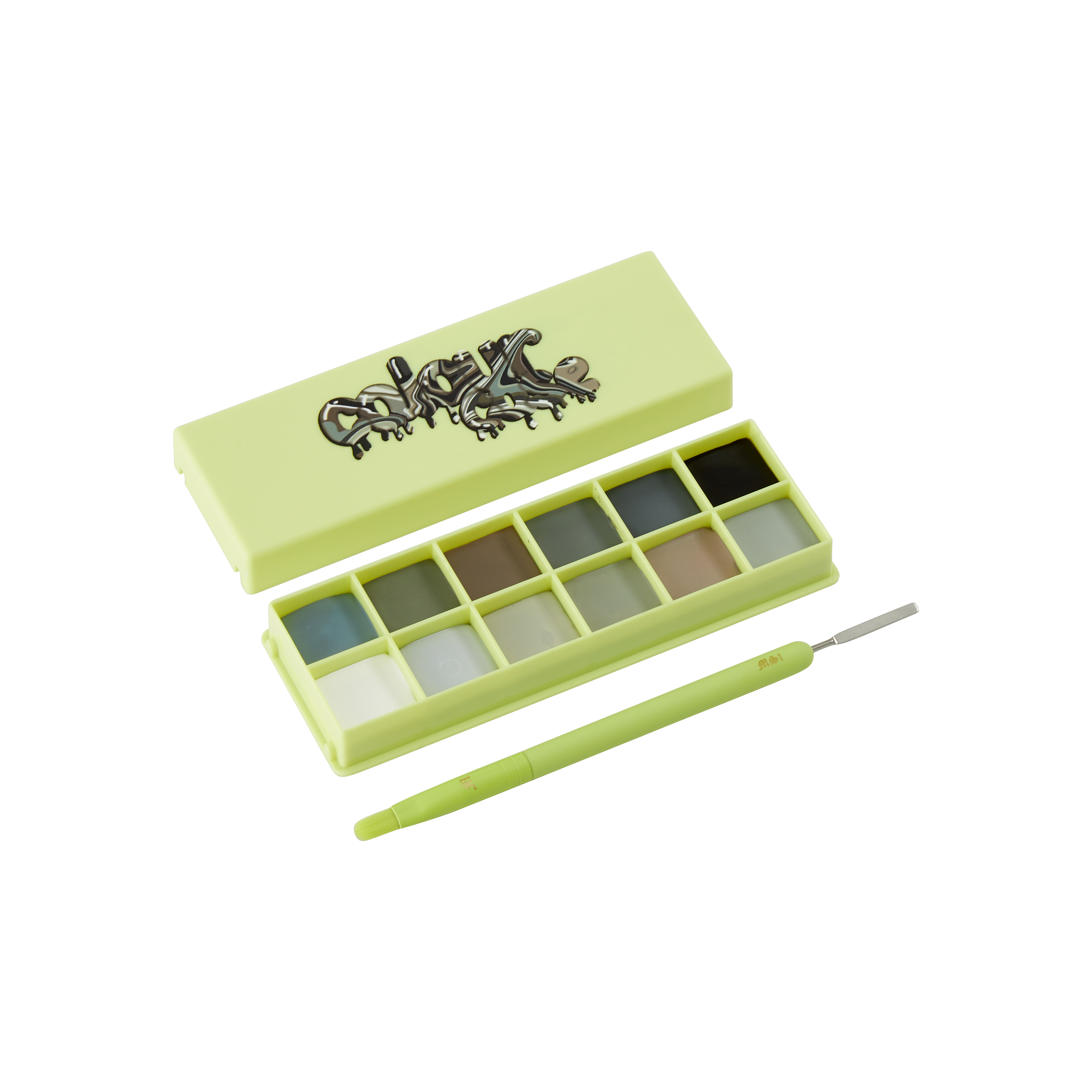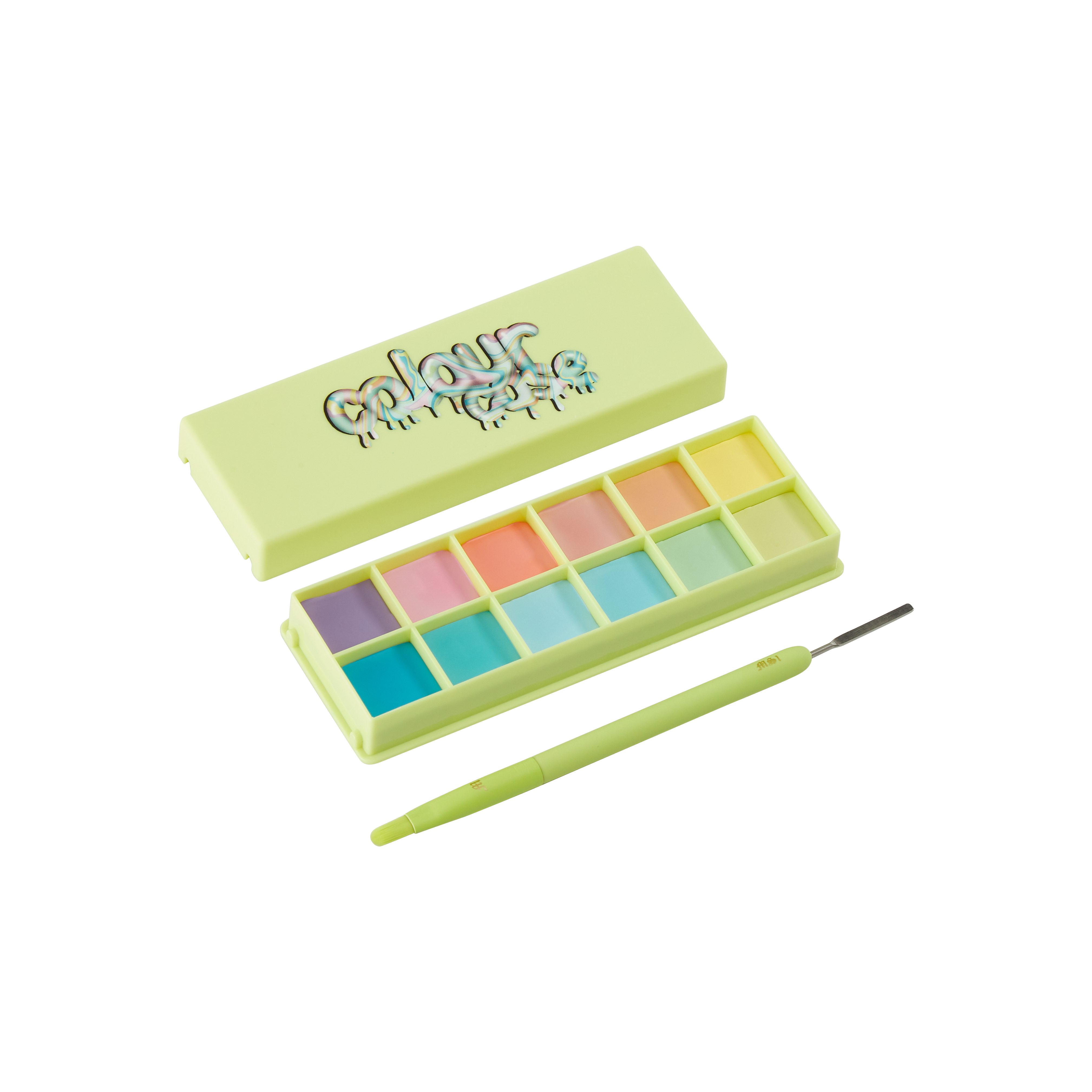 Colour cases is a 12 pot palette of cream formula, that dries to a matte finish. The palette is specially curated to be 12 significant stand alone colours, but providing 12 ideal mixing pigment mediums to create ENDLESS shade possibilities. Whether it’s mixing the perfect hue for an eyebase, colour correcting or cut creasing ( the possibilities are truly endless), the answer is most probably in a colour case. Simply use the tool provided to scoop up some of the product to the back of your hand, using warmth to activate the formula. Apply sparingly to build up the consistency and apply as necessary.